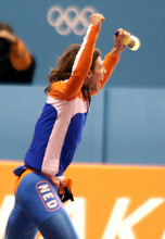 Speedskater Annamarie Thomas of the Netherlands congratulates American Joey Cheek after Cheek wo