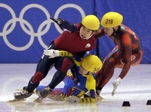 Korea's Hyun-soo Ahn crashes into American short-track speedskater Apolo Anton Ohno in the final turn of the men's 1,000 meters, taking Canada's Mathieu Turcotte with him and clearing the way for Australian Steven Bradbury to come from far behind and win gold at the Delta Center.