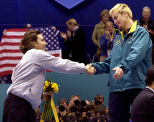 American Apolo Anton Ohno congratulates Australia's Steven Bradbury -- the man who made Ohno's skating boots in his backyard shop -- for winning the men's 1,000 meters in short-track speedskating after Ohno and three others crashed on the final turn at the Delta Center.