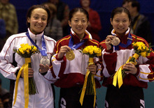 Silver medalist Evgenia Radanova of Bulgaria, left, joins gold medalist Yang Yang (A) of China and bronze medalist Wang Chunlu of China at the medal ceremony following the women's 500-meter short-track race at the Delta Center.