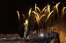 The ceremony culminated with the lighting of the caldron by captain Mike Eruzione and almost all of his teammates from the "Miracle on Ice" hockey team that surprisingly won gold at the 1980 Lake Placid Olympics.