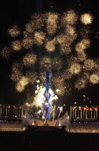 "The flame traveled slowly up the 117-foot base toward the glass bowl at the top. Gas was being fed to jets along the way. The flow was engineered to grow as the flame neared the top, but, instead, the flame was growing smaller as it ascended. Strong gusts of wind were dispersing the gas faster than it could fuel the flame," he wrote later. "Was it going out entirely? I didn't breathe. There were a few gasps from around me. And then, flash, the whole caldron bowl was swirling with flame, now shooting 25 feet into the air. Glorious, glorious, glorious!"