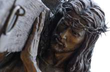 From the crown of thorns to the pain and exhaustion of hours of beatings and scourging that preceded his execution to legs straining to carry the weight no detail is spared. Even the statue's feet, toes gripping the rock, show the struggle.