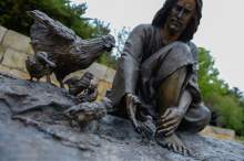 Still, "Light of the World" balances its terrors and sadness with scenes of triumph and love. The "His Gathering" sculpture may be the most poignant of the latter. In this scene, Christ crouches down next to mother hens and gently guides chicks back to protective wings. That gesture, Johnson says, "charms me and fills me with infinite delight.