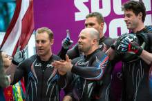 USA's Steven Holcomb, Chris Fogt, Curtis Tomasevicz, and Steve Langton, celebrate during t