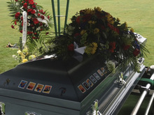 A group of nine family members gathered around the casket for a dedication, before the boys' aunts handed out Lightening McQueen stickers from the movie "Cars" as well as Spiderman decorations to adorn the sides of the casket.