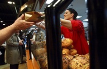 Artisan bread tech Lora Powell hands out free loaves of bread on Wednesday during the opening of the new Harmons grocery store in downtown Salt Lake City. The store at 100 S. 135 East was built on two levels. A 50,000-square-foot ground level features a large produce department and meat counter with fresh fish. On the 18,000-square-foot mezzanine there is a deli with a seating capacity for about 300 customers.