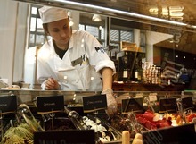 Fabbri gelato tech Lydia Fredrickson spoons up free samples of gelato during the grand opening. The new Harmons grocery opened Wednesday in downtown Salt Lake City. The store at 100 S. 135 East was built on two levels. A 50,000-square-foot ground level features a large produce department and meat counter with fresh fish. On the 18,000-square-foot mezzanine there is a deli with a seating capacity for about 300 customers.