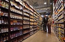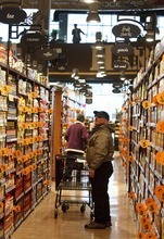 Stephanie Jordan and Randy Frisk, vendors from Sacramento, Calif., peruse the BBQ sauce aisle. The new Harmons grocery opened Wednesday in downtown Salt Lake City. The store at 100 S. 135 East was built on two levels. A 50,000-square-foot ground level features a large produce department and meat counter with fresh fish. On the 18,000-square-foot mezzanine there is a deli with a seating capacity for about 300 customers.
