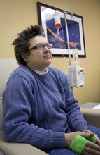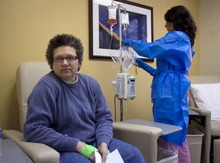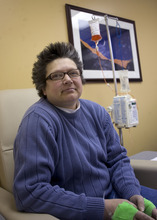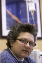Morning sun peeks through the blinds of an infusion room as Brenda Olson settles in for a two-hour intravenous dose of Doxil.