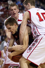 Herriman's Kyle Sanford, double-teamed by Bountiful's Brock Yates, left, and Brit Harding (10). Bountiful vs. Herriman, 4A High School Basketball Championships Wednesday, February 29, 2012 at the Maverik Center in West Valley City, Utah.