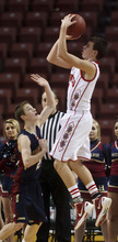 Bountiful's Brit Harding shoots, with Herriman's Jaden Rasmussen at right. Bountiful vs. Herriman, 4A High School Basketball Championships Wednesday, February 29, 2012 at the Maverik Center in West Valley City, Utah.