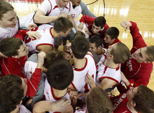 Bountiful players huddle pre-game. Bountiful vs. Herriman, 4A High School Basketball Championships Wednesday, February 29, 2012 at the Maverik Center in West Valley City, Utah.