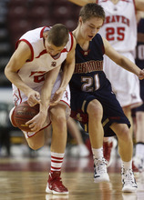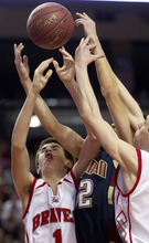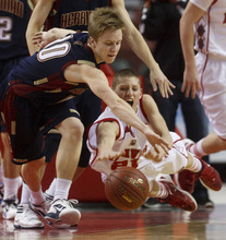 Bountiful's Dain Murdock and Herriman's Brady Beard scramble for the ball. Bountiful vs. Herriman, 4A High School Basketball Championships Wednesday, February 29, 2012 at the Maverik Center in West Valley City, Utah.