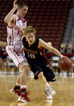 Herriman's Tanner McKissick drives past Bountiful's Brit Harding. Bountiful vs. Herriman, 4A High School Basketball Championships Wednesday, February 29, 2012 at the Maverik Center in West Valley City, Utah.