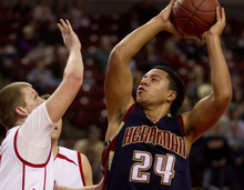 Bountiful's Zach Seljaas shoots over Herriman's Brady Beard. Bountiful vs. Herriman, 4A High School Basketball Championships Wednesday, February 29, 2012 at the Maverik Center in West Valley City, Utah.