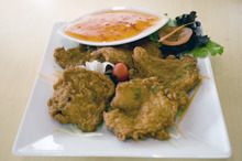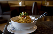 Open for lunch Monday through Friday, the $7.35 lunch combination offers 12 options (curries, stir-fries, noodles and a soup choice) and includes two steamed shrimp dumplings packed with shrimp paste and a choice of a large house salad or vegetable soup.