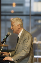 Former Salt Lake Mayor Rocky Anderson recounts stories of Richard Wirick during a memorial service for him at Gallivan Hall at Gallivan Plaza in Salt Lake City on March 8, 2012.