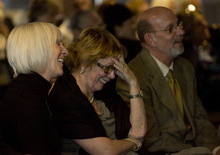 (from left) Family friend Terri Jackson, Karen Zumbado, and Steve Wirick, son of Richard Wirick laugh as someone tells a funny story about Richard Wirick during a memorial service for him at the Gallivan Hall at Gallivan Plaza in Salt Lake City on March 8, 2012.