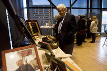 Bob Cummings looks at a display of photographs and other memorabilia of Richard Wirick's during a memorial service for him at the Gallivan Hall at Gallivan Plaza in Salt Lake City on March 8, 2012.