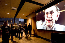People gather to watch a video of Richard Wirick during a memorial service for him at Gallivan Hall at Gallivan Plaza in Salt Lake City on March 8, 2012.