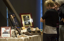 People look at a display of photographs and other memorabilia of Richard Wirick's during a memorial service for him at Gallivan Hall at Gallivan Plaza in Salt Lake City on March 8, 2012.