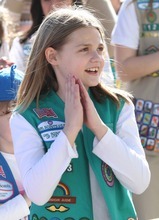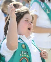 Zoe Price, Midvale, joins more than 1,500 Girl Scouts, at the Capitol to celebrate the Girl Scouts' history by singing songs, performing a "flash mob," and enjoying Girl Scout birthday cup cakes and celebrate March 12th as Girl Scout day in Utah, Monday, March 12, 2012.
