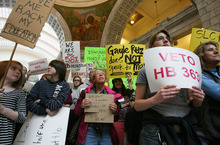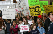 During the rally, grandparents, parents, teens and children held colorful signs that read, "Veto HB363," "STDs don't save themselves for marriage" and "Education Not Ignorance." Between speakers, the crowd unleashed thunderous chants of, "Veto!"