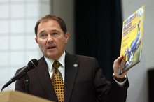 Gov. Gary Herbert illustrates his point about moving education forward with the classic book "The Little Engine that Could" during a flag presentation put on by the third-grade class by Falcon Ridge Elementary in West Jordan before he signed into law three education-related bills at the school on Tuesday, March 27, 2012.