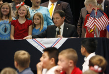 Governor Gary R. Herbert praises the flag presentation put on by the third-grade class from Falcon Ridge Elementary in West Jordan as he gets ready to signs three education-related bills at the school on Tuesday, March 27, 2012.