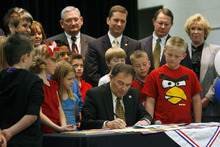 Gov. Gary Herbert, surrounded by state representatives and third-graders from Falcon Ridge Elementary in West Jordan signs three education-related bills following a flag ceremony assembly on Tuesday, March 27, 2012.