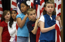 Third-graders at Falcon Ridge Elementary Emily Hewitt, 8, Madeline Leano, 9, Pisila Fangupo, 9, Jack Anderson, 8, and Eve Benedict, 8, from left, get ready for a flag presentation where Governor Gary R. Herbert signed into law three education-related bills at at the school in West Jordan on Tuesday, March 27, 2012.
