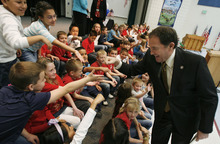 Governor Gary R. Herbert gets a few fist bumps and hand shakes from third-graders at Falcon Ridge Elementary in West Jordan following a flag ceremony where the governor signed three education-related bills on Tuesday, March 27, 2012.