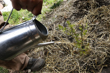 Potato planter • Build a wooden box around a cluster of potato plants. As they grow, cover the plants with mulch and straw. Potatoes will continue to set below the exposed foliage.