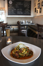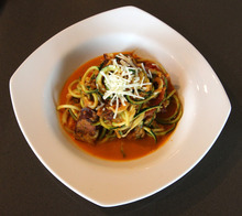 The zucchini ribbons with marinara and spicy chicken sausage ($11) entrée on the dinner menu admirably delivered on the taste and health fronts, and the addition of a generously-sized dinner salad ($3) with dark, leafy greens, raw peas and red peppers, left my weight-lifting husband satiated.