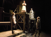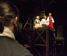 Plan-B's production is stark and straightforward, grounded by Randy Rasmussen's monolithic wooden scaffold set with its iconic cross, a synthesis of condemnation and salvation. Jesse Portillo's soft, muted spotlighting highlights characters and focuses attention. Phillip Lowe's period costumes are subdued and austere, a sharp contrast to Pearl's vibrant red dress. Director Cheryl Cluff's rich sound design combines the gossiping whispers of the enveloping Puritan community we never see with a capella choral music, much of it religious and centered on the "Kyrie Eleison (Lord have mercy)."