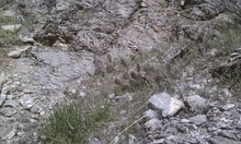 From the trailhead, take the east (right) branch and go uphill east, north, east and north again. You will see a little homemade bike ramp below. At 0.2 mile, bear right through the trail junction. At a half-mile, the trail will curve north and go between a water tank and a retaining pond. This is Wagner Spring. You'll see an ambiguous fork north of the pond. Take the left trail (the right just dead-ends after a few yards). You'll reach another intersection at 0.6 mile; bear right and continue uphill. Where the slope opens up to your left, look for clusters of cacti.