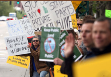 Outside the Governor's Mansion, about 80 protesters gathered, carrying signs opposing HB148, a bill signed last month by Herbert that demands Congress turn over nearly 30 million acres of federal land within Utah's borders.