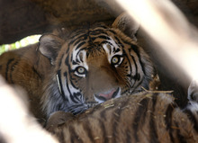 The zoo's stunning Amur tigers, a trio of brothers, become even more fearful in their dazzling symmetry after reading the Water Week placard nearby.