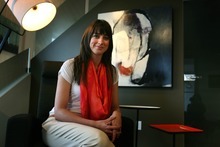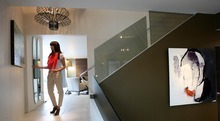 Mikell Stringham among the paintings of the artists she represents Wednesday March 30, 2011 at Light Spot. Mikell Stringham operates Mondo Fine Art, an online contemporary art gallery. Stringham has pop-up shows at hip loft condos and various business spaces including Light Spot, interior design. Walt Cowie is owner of Light Spot.