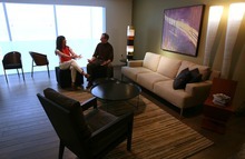 Mikell Stringham among the paintings of the artists she represents Wednesday March 30, 2011 at Light Spot, with owner Walt Cowie (right). Mikell Stringham operates Mondo Fine Art, an online contemporary art gallery. Stringham has pop-up shows at hip loft condos and various business spaces including Light Spot, interior design. Walt Cowie is owner of Light Spot.