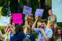 They stood with their backs to him as he spoke, many wearing tape over their mouths and holding signs saying the party silenced them as Corroon spoke against the sort of divisiveness shown in the chairman race.