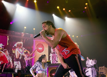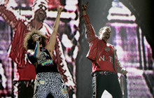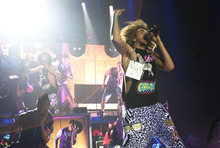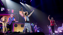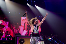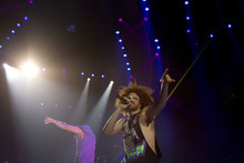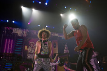 But with little bread, there were plenty of circuses. The two-tier stage was festooned with inflatable trees and zebras, bright green lasers shot from the stage, the confetti budget rivaled that of a GSA convention, and at one point Redfoo was hoisted toward the rafters with another relic from the 1980s, a keytar, in his hands. It was the embodiment of the opening credits of "Miami Vice."