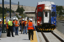 The Utah Transit Authority used Monday's announcement to move the first FrontRunner train into Utah County and to urge safety around tracks that are now carrying trains for the first time.