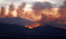 Winds were pushing the fire northeast, toward the threatened buildings, Haynes said. Cabins, trailers, power lines, major transmission power lines, outbuildings and historic log cabins are at risk. The fire jumped over Argyle Canyon Road, which crews hoped would serve as a firebreak.