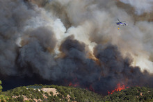 In Sanpete County, the Wood Hollow Fire believed at least partially ignited by the short-circuit of a Rocky Mountain Power utility pole compromised by the theft of copper wiring was still just 20 percent contained and had been newly GPS-mapped at 46,190 acres. About 700 firefighters battled the flames, supported in the air by water-bearing helicopters and air tankers dropping amber ribbons of fire retardant along hot spots on the blaze's southeast and northeast edges.