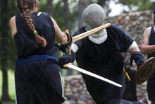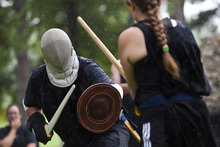 Using a Viking short sword and buckler, Darrell Armstrong, of West Valley City, competes against Heather Rentz, of Holladay, and her great sword, during the United Clans Swordsman Association sword fighting competition at Liberty Park Saturday July 14, 2012. Twelve people competed in the twice-yearly event.
