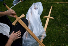 Zeb Bjorge puts away his long sword, made from hickory wood, during the United Clans Swordsman Association sword fighting competition at Liberty Park Saturday July 14, 2012. Twelve people competed in the twice-yearly event.