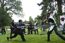 Jack Stewart, left, and Zeb Bjorge compete during the United Clans Swordsman Association sword fighting competition at Liberty Park Saturday July 14, 2012. Twelve people competed in the twice-yearly event.