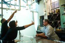 Andres Gorman, Hillary Merrill and Mark Silvester tear down the Zion Curtain around the restaurant bar at Current Fish & Oyster in Salt Lake City on Saturday, July 1, 2017. A new law goes into effect Saturday, allowing restaurants options other than the 7-foot opaque barrier intended to block children from seeing drinks being mixed. Restaurants can choose to keep the "Zion Curtain"; create a 10-foot buffer from the bar where minors are not allowed; or build a half-wall or railing, at least 42 inches high, that creates a delineation between the dining and liquor-dispensing areas.